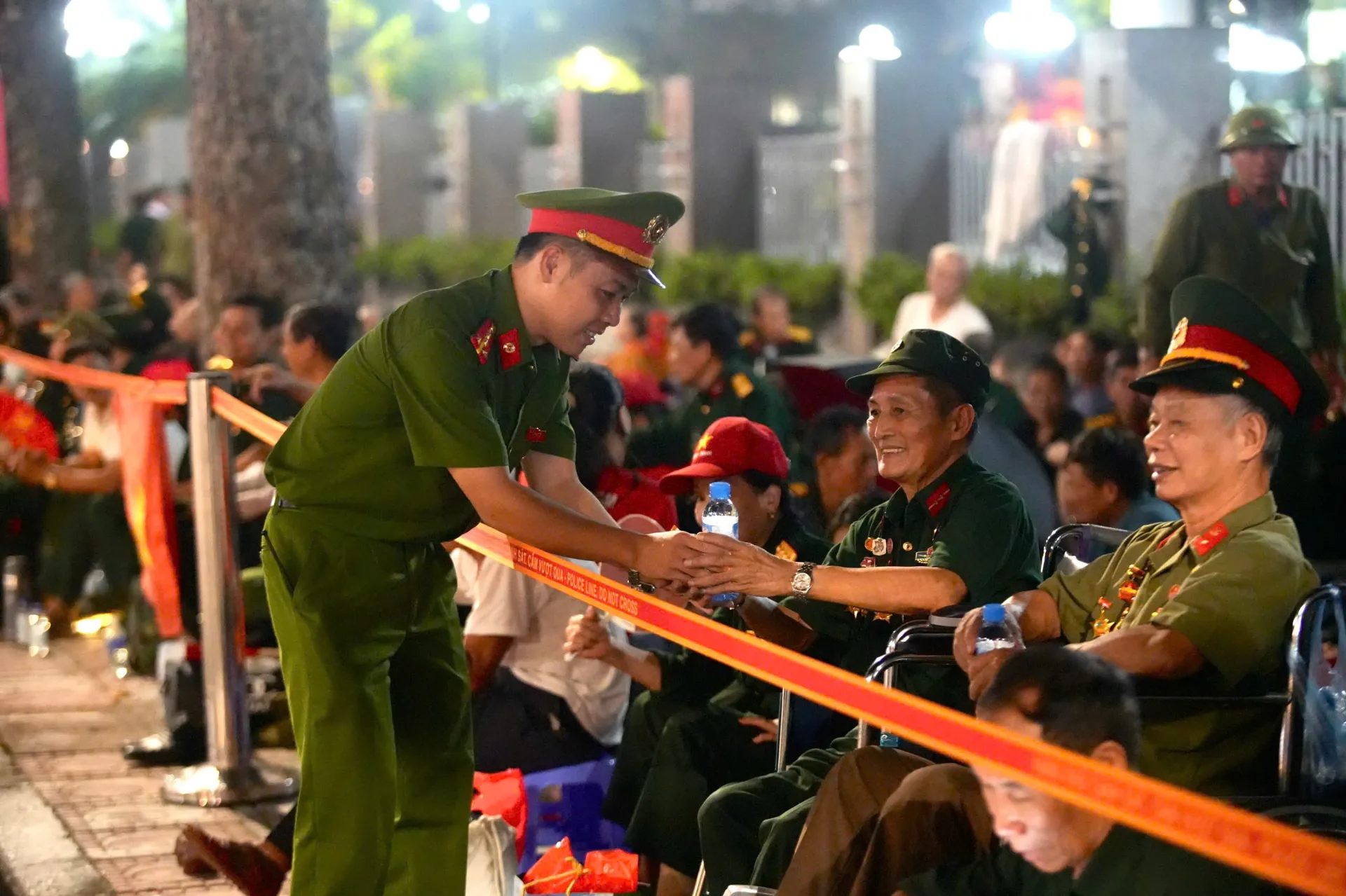 Cán bộ công an tặng nước uống cho các cựu chiến binh tham dự sự kiện A80. Ảnh: Duy Khánh.