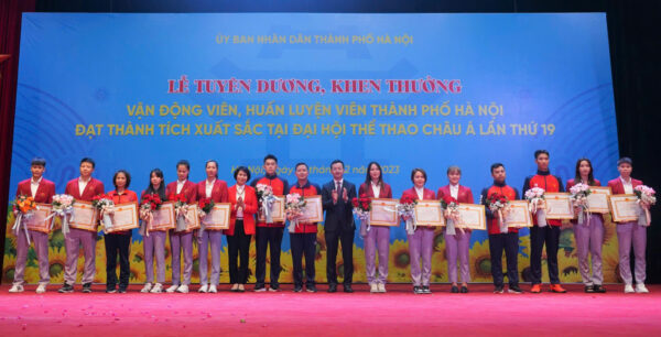 Phó Giám đốc Sở Văn hóa và Thể thao Phạm Xuân Tài trao bằng khen của Chủ tịch UBND thành phố cho các Vận động viên đạt thành tích xuất sắc tại Đại hội Thể thao Châu Á lần thứ 19. Ảnh minh họa