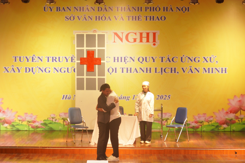 Chính vì vậy, một trong những điểm nhấn nổi bật của Hội nghị là 02 tiểu phẩm tuyên truyền được dàn dựng theo hình thức sân khấu hóa do Nhà hát Kịch Hà Nội thực hiện. Tiểu phẩm “Tình huống khó xử” phản ánh sinh động những câu chuyện rất quen thuộc nơi công sở như đi muộn, trang phục chưa đúng quy định, mối quan hệ quen biết – nể nang, xin xỏ…, qua đó đặt ra vấn đề về trách nhiệm, kỷ cương và bản lĩnh của người thực thi công vụ. Trong khi đó, tiểu phẩm “Vì ngày mai” lại tập trung vào các tình huống ứng xử trong gia đình, nhà trường và nơi công cộng, cho thấy tác động trực tiếp của hành vi, lời nói của người lớn đến nhận thức và hành động của học sinh.