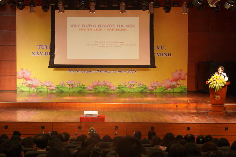 Tiến sĩ Lê Thị Thu Hương – Viện trưởng Viện Hà Nội học và Đào tạo quốc tế, Trường Đại học Thủ đô Hà Nội phổ biến nhiệm vụ xây dựng người Hà Nội thanh lịch, văn minh.