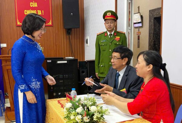 Chủ tịch Ủy ban Mặt trận Tổ quốc Việt Nam thành phố Hà Nội Bùi Huyền Mai thực hiện quyền công dân, động viên cử tri Khu vực bỏ phiếu số 19, phường Tây Hồ.