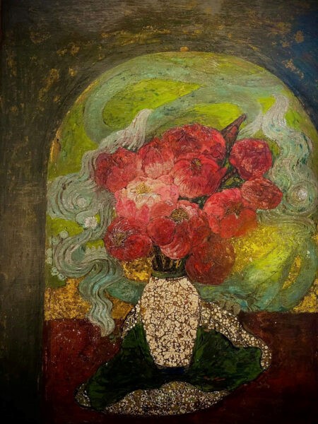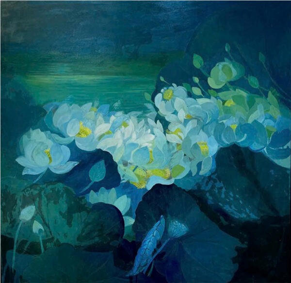Three female artists from different generations converge like confluent streams in this exhibition. Hoang Huong Giang’s artistic flow brims with emotion through her vibrant lotus paintings, imbued with ethereal qualities and poetic contemplations of life.