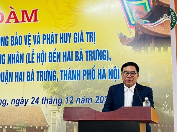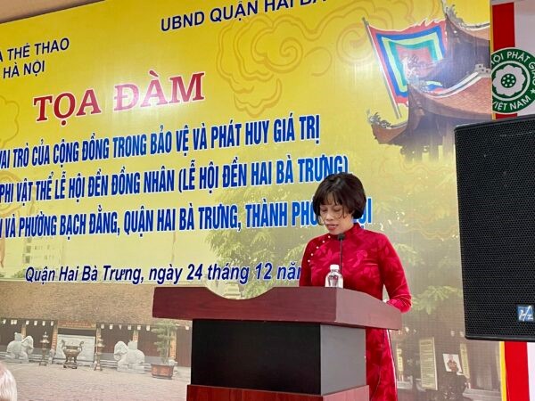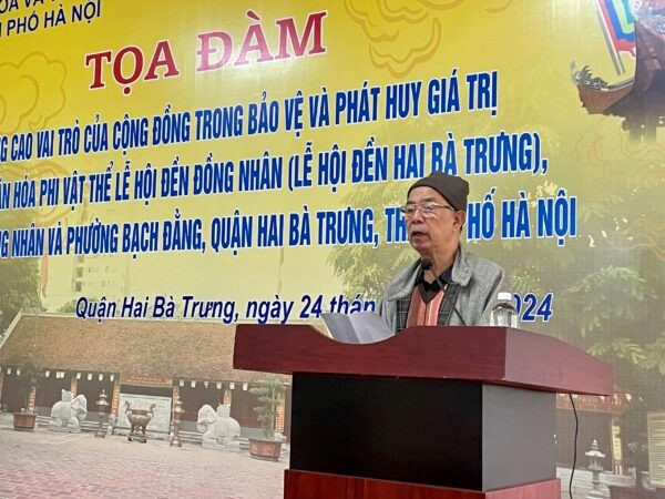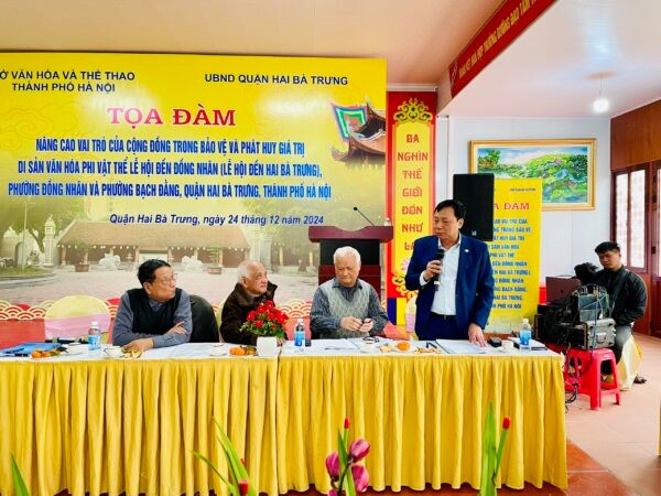 On the morning of December 24, at the special national historical site of Hai Ba Trung Temple-Pagoda-Communal House, the Hanoi Department of Culture and Sports coordinated with the People’s Committee of Hai Ba Trung District to organize a seminar on “Enhancing the role of the community in protecting and promoting the intangible cultural heritage values of Dong Nhan Temple Festival, in Dong Nhan Ward and Bach Dang Ward, Hai Ba Trung District, Hanoi”. Attendees at the seminar included the following representatives: Mr. Do Dinh Hong, member of the City Party Committee cum Director of the Hanoi Department of Culture and Sports; Mr. Nguyen Van Nam, member of the City Party Committee cum Secretary of Hai Ba Trung District Party Committee; Ms. Nguyen Thi Thu Hien, member of the Standing Committee of the District Party Committee cum Vice Chairman of the People’s Committee of Hai Ba Trung District… Notably, the seminar was attended by many scientists and researchers: Assoc. Prof. Dr. Do Van Tru, President of the Vietnam Cultural Heritage Association; Assoc. Prof. Dr. Dang Van Bai, Vice Chairman of the National Cultural Heritage Council; Prof. Dr. Le Hong Ly, President of the Vietnam Folklore Association; Prof. Tran Lam Bien; Assoc. Prof. Dr. Tran Duc Cuong, President of the Vietnam History Science Association; Assoc. Prof. Dr. Phạm Lan Oanh, Institute of Cultural and Art Studies, Vietnam; Dr. Le Thi Thu Huong, Director of the Hanoi Institute, Hanoi Metropolitan University; Dr. Nguyen Thi Don, Vice President of Thang Long – Hanoi Cultural Heritage Association. Also attending the seminar were representatives from the Culture and Information Departments of the districts: Ha Dong, Hoan Kiem, Ba Dinh, Dong Da, Long Bien, Cau Giay, Thanh Xuan, Tay Ho, Nam Tu Liem, Bac Tu Liem; and representatives from communities where the temples honoring Hai Ba Trung interact with Dong Nhan village community.