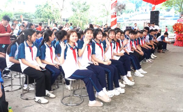 Các em học sinh nhiệt tình cổ vũ các vận động viên thi đấu.