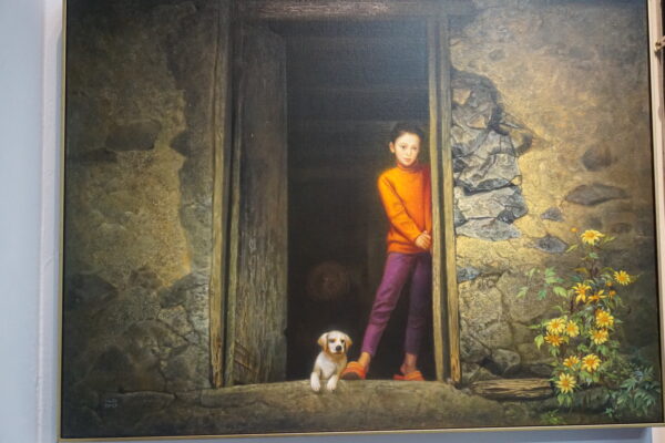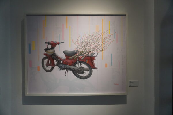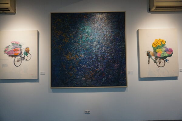 Với Trịnh Liên, trưởng nhóm họa sĩ lưu động, hội họa là hành trình trực tiếp đối thoại với thiên nhiên. Vẽ ngoài trời, giữa mưa nắng và những dịch chuyển liên tục, anh đưa người xem trở lại những cảm xúc nguyên sơ. Phong cảnh trong tranh không chỉ là cảnh vật bên ngoài, mà như khu vườn tâm tưởng – nơi màu sắc và ký ức đan xen.Cùng khai thác ngôn ngữ POP Art, Nguyễn Thế Hùng và Nguyễn Tuấn Dũng lại mở ra hai hướng đi riêng. Nguyễn Thế Hùng kết hợp mô-típ truyền thống với chất liệu sơn mài trên toan; những đường nét vàng son trên dung nhan thiếu nữ gợi vẻ đẹp như mùa xuân vừa chớm – rất “tình” và rất “xuân”… Trong khi đó, Nguyễn Tuấn Dũng đưa đời sống thường nhật vào tranh trên nền giấy báo bồi, những lớp thông tin lặp lại của phố thị, những gánh hoa rong – như tín hiệu về nhịp sống đang tiếp diễn, nhắc ta trân trọng vẻ đẹp luôn hiện diện trong từng khoảnh khắc.