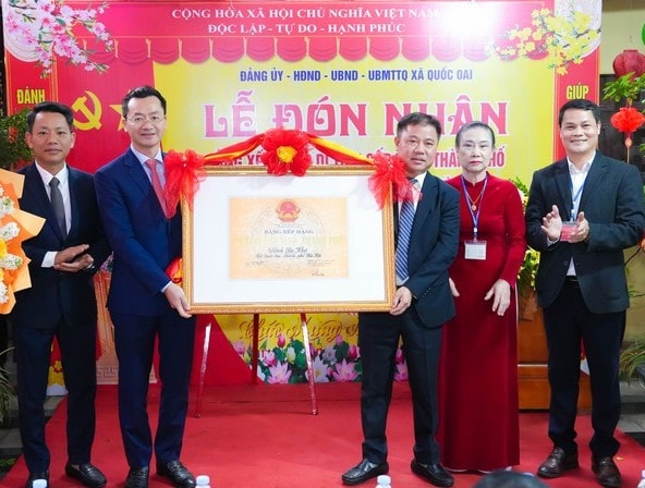 Phó Giám đốc Sở Văn hóa và Thể thao Hà Nội Phạm Xuân Tài trao Bằng xếp hạng Di tích cấp thành phố đối với đình Sài Khê, xã Quốc Oai. Ảnh: Hoàng Sơn