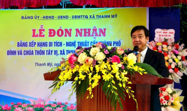 Phát biểu tại buổi lễ, đồng chí Lê Đại Thăng – Uỷ viên Thường vụ Thị ủy – Phó Chủ tịch UBND thị xã Sơn Tây đã chúc mừng Đảng bộ, chính quyền và Nhân dân thôn Tây Vị nói riêng, xã Thanh Mỹ nói chung, đồng thời đề nghị cấp ủy Đảng, chính quyền, ban ngành, đoàn thể, Nhân dân xã Thanh Mỹ và thôn Tây Vị đẩy mạnh công tác tuyên truyền, giáo dục về giá trị các di tích lịch sử, văn hóa gắn với việc giáo dục truyền thống yêu nước, lòng tự hào dân tộc, tinh thần đoàn kết gắn bó trong cộng đồng dân cư, ý thức giữ gìn, bảo vệ di sản văn hóa trong nhân dân, nhất là thế hệ trẻ. Nêu cao tinh thần trách nhiệm, chung tay bảo tồn và phát huy giá trị di tích đình – chùa Tây Vị xứng tầm với vị thế của một di sản cấp thành phố; gắn trách nhiệm của chính quyền, các đoàn thể ở xã, thôn trong việc bảo vệ và phát huy giá trị di tích; bảo tồn có chọn lọc các giá trị văn hóa truyền thống tốt đẹp, đặc sắc trong các di sản văn hóa trên địa bàn. Đồng chí nhấn mạnh việc quan tâm đến công tác tu bổ, phòng chống mối, quản lý xây dựng các công trình xung quanh di tích, tránh tình trạng gây ảnh hưởng đến không gian, cảnh quan sinh thái của di tích, góp phần thực hiện hiệu quả chỉ đạo của các cấp và Nghị quyết số 12-NQ/TU ngày 1-6-2021 của Thị uỷ Sơn Tây về “Tăng cường công tác quản lý, bảo tồn và phát huy giá trị các di tích lịch sử, văn hóa, gắn với phát triển kinh tế du lịch thị xã giai đoạn 2021-2025, định hướng đến năm 2030″….