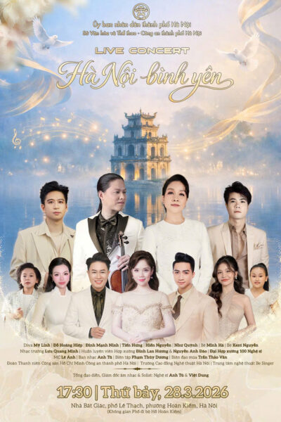 Live Concert “Hà Nội bình yên” sẽ diễn ra từ 17h30 đến 19h00, thứ Bảy, ngày 28/3/2026 tại Nhà Bát Giác, trong không gian phố đi bộ Hồ Hoàn Kiếm, Hà Nội.