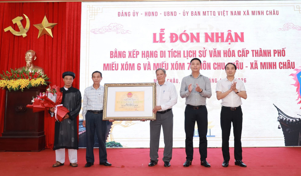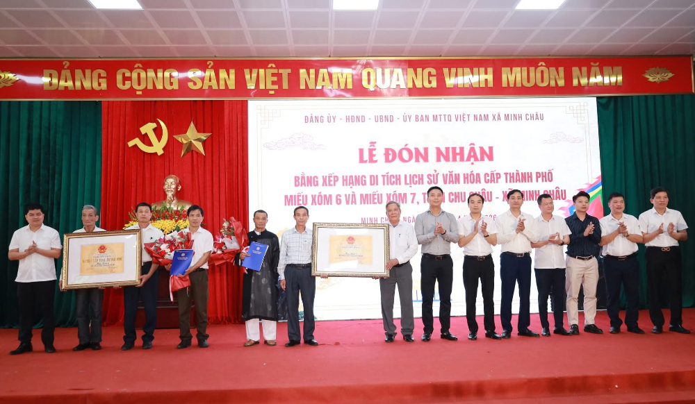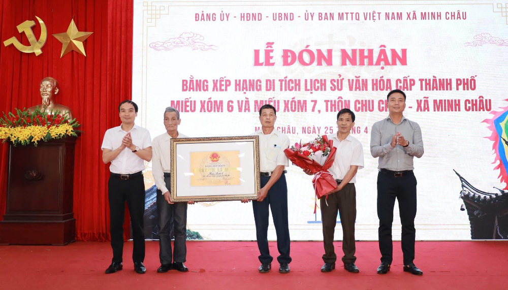 Ngày 25/4/2026, xã Minh Châu long trọng tổ chức Lễ đón nhận Bằng xếp hạng Di tích lịch sử – văn hóa cấp Thành phố đối với Miếu xóm 6 và Miếu xóm 7, thôn Chu Châu. Sự kiện đánh dấu bước phát triển mới trong công tác bảo tồn và phát huy giá trị di sản trên địa bàn.