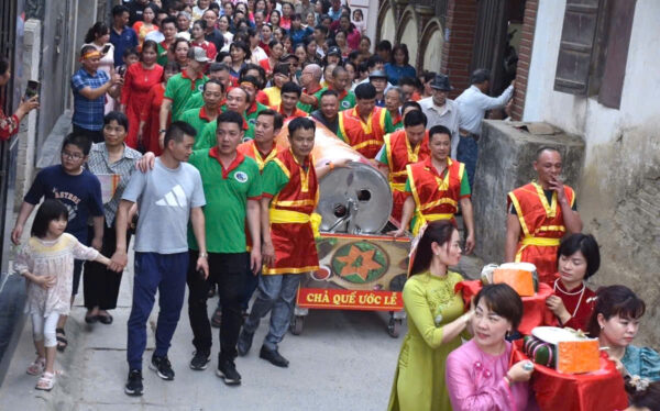 Rước ống chả quế hơn 100kg dâng Thánh tại Lễ hội làng nghề truyền thống giò chả Ước Lễ năm 2025. Ảnh: Internet