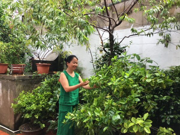 Trong ngôi nhà nhỏ rợp mát cỏ cây, hoa lá, chị Hương say sưa trò chuyện với khách về những hoạt động của CLB Hò cửa đình, múa hát bài Bông làng Phú Nhiêu, về niềm đam mê với môn nghệ thuật truyền thống này của chị.