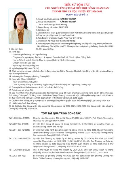 Đơn vị bầu cử số 13 gồm các phường: Hà Đông, Dương Nội, Yên Nghĩa, Phú Lương, Kiến Hưng. Tổng số người ứng cử đại biểu Hội đồng nhân dân Thành phố Hà Nội trong danh sách là 08 người, số đại biểu được bầu là 05 người.