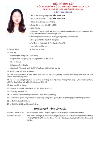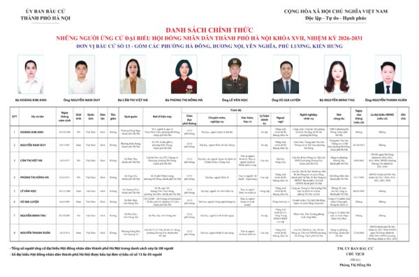 Ủy ban Bầu cử thành phố Hà Nội đã ban hành Quyết định số 50/QĐ-UBBC ngày 20/2/2026 về việc công bố danh sách chính thức những người ứng cử đại biểu Hội đồng nhân dân thành phố Hà Nội khóa XVII, nhiệm kỳ 2026 – 2031.