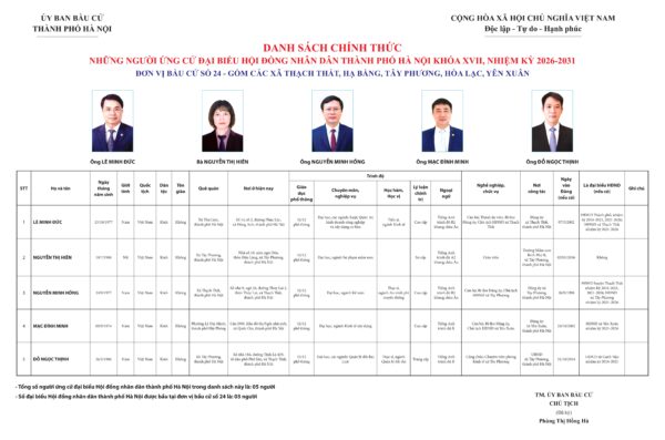 Ủy ban Bầu cử thành phố Hà Nội đã ban hành Quyết định số 50/QĐ-UBBC ngày 20/2/2026 về việc công bố danh sách chính thức những người ứng cử đại biểu HĐND thành phố Hà Nội khóa XVII, nhiệm kỳ 2026 – 2031.