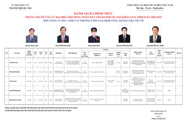 Ủy ban Bầu cử TP Hà Nội đã ban hành Quyết định số 50/QĐ-UBBC ngày 20/2/2026 về việc công bố danh sách chính thức những người ứng cử đại biểu Hội đồng nhân dân thành phố Hà Nội khóa XVII, nhiệm kỳ 2026 – 2031.