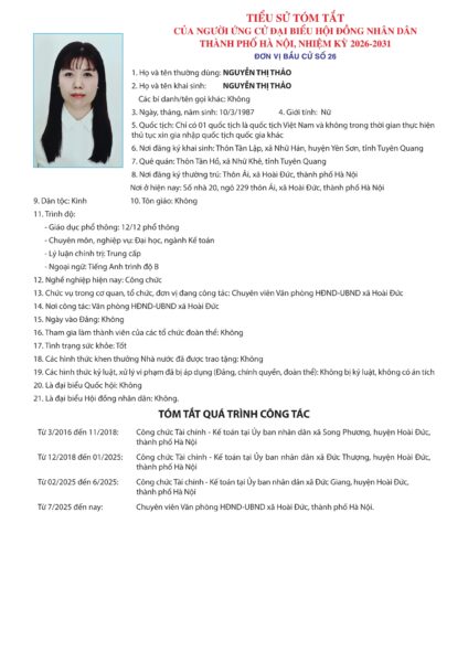 Đơn vị bầu cử số 26 gồm các xã Hoài Đức, Dương Hoà, Sơn Đồng, An Khánh, với 8 ứng cử viên. Sau đây là tóm tắt tiểu sử của các ứng cử viên: