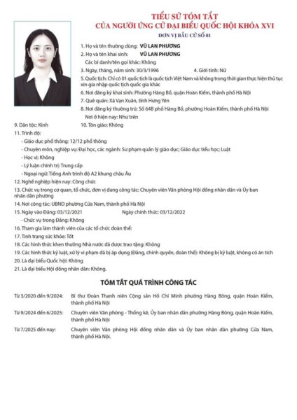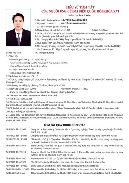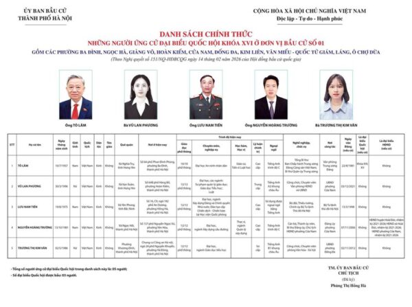 Ngày 20/02/2026, Ủy ban Bầu cử thành phố Hà Nội đã ban hành Quyết định số 48/QĐ-UBBC về việc công bố danh sách chính thức những người ứng cử đại biểu Quốc hội khóa XVI theo từng đơn vị bầu cử tại thành phố Hà Nội.