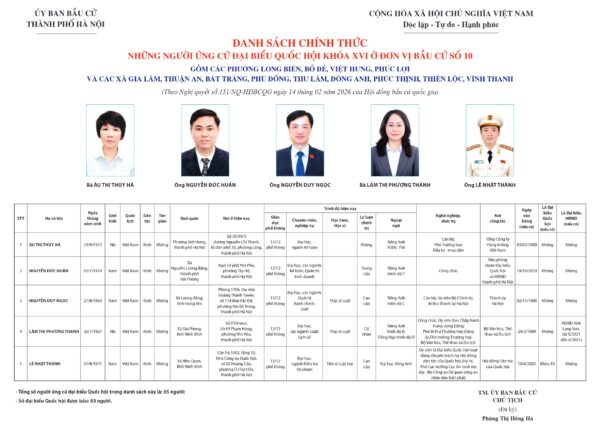 Ngày 20/02/2026, Ủy ban Bầu cử thành phố Hà Nội đã ban hành Quyết định số 48/QĐ-UBBC về việc công bố danh sách chính thức những người ứng cử đại biểu Quốc hội khóa XVI theo từng đơn vị bầu cử tại thành phố Hà Nội.