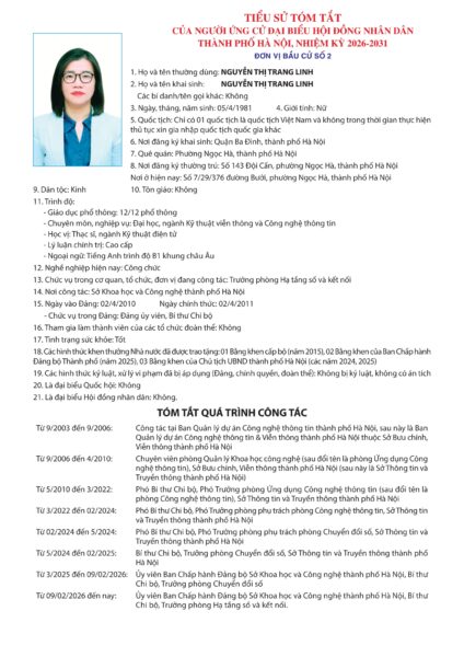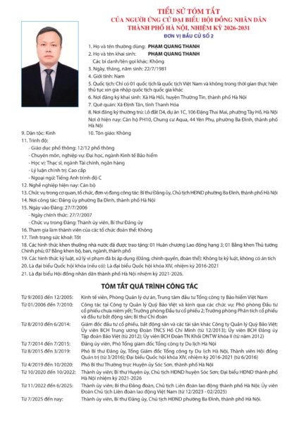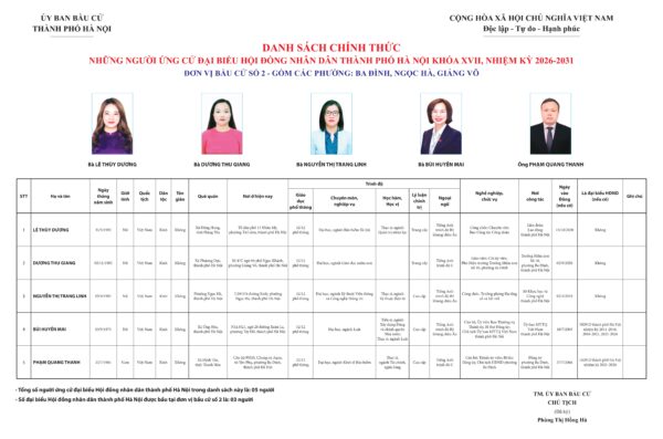 Đơn vị bầu cử số 2 gồm các phường Ba Đình, Ngọc Hà, Giảng Võ. Tổng số người ứng cử đại biểu HĐND Thành phố Hà Nội nhiệm kỳ 2026-2031 trong danh sách chính thức là 05 người, số đại biểu được bầu là 03 người.