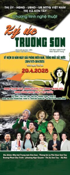 Chào mừng 50 năm Giải phóng hoàn toàn miền Nam thống nhất đất nước 30/4, tối ngày 29/4/2025, tại Trung tâm văn hóa Sơn Tây sẽ tổ chức 1 chương trình nghệ thuật nữa, mang tên Kí ức Trường Sơn. Chương trình do Thị ủy – HĐND-UBND – UBMTTQ thị xã Sơn Tây tổ chức. Tại chương trình này, nhiều nghệ sĩ nổi tiếng sẽ về với Sơn Tây và biểu diễn cho Nhân dân Sơn Tây – xứ Đoài xem, như: NSND Thanh Hoa, Quang Thọ, Trung Đức; NSƯT Việt Hoàn, cùng một số nhóm nhạc và vũ đoàn…