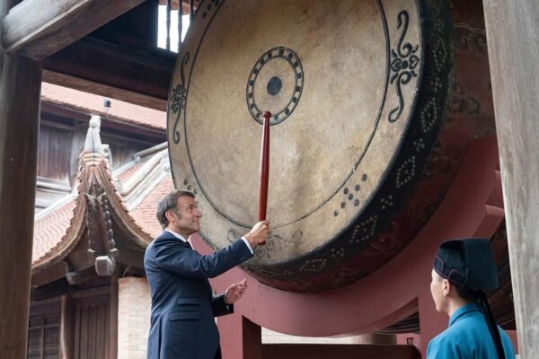 Tổng Bí thư Tô Lâm đã mời Tổng thống Emmanuel Macron đánh trống Sấm tại khu Thái Học. Tiếng trống vang vọng giữa không gian linh thiêng như một biểu tượng của tinh thần khai mở tri thức, đồng thời là lời khẳng định cho mối quan hệ hữu nghị bền chặt giữa hai quốc gia, cùng hướng tới hòa bình, phát triển và tôn vinh giá trị văn hóa.
