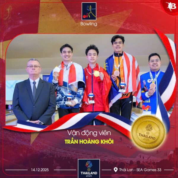 Trần Hoàng Khôi (VĐV Hà Nội trong đội tuyển Bowling Việt Nam) đã tạo nên cột mốc đáng nhớ tại SEA Games 33 khi xuất sắc giành Huy chương Vàng nội dung đơn nam môn Bowling khi mới 16 tuổi và vẫn còn là học sinh.