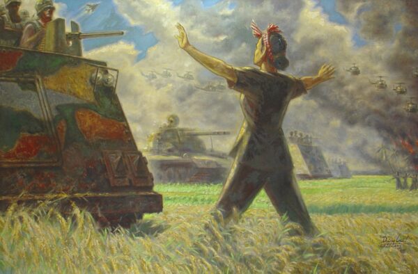 Trung tâm Triển lãm là tấm pano cao 4m dài 45m in phóng to sắc nét các tác phẩm hội họa sơn mài, sơn dầu và các ký họa chiến trường của các họa sĩ quân đội từng tham gia kháng chiến như: Huy Toàn, Lê Lam, Trần Hữu Chất, Phạm Ngọc Liệu, Phan Oánh và các họa sĩ thế hệ sau như Trịnh Bá Quát, Ngân Chài, Đinh Công Khải, Thế Hữu, Đào Hoa Vinh… Cùng với đó là các tác phẩm của những họa sĩ sinh ra và lớn lên trong hòa bình nhưng cũng rất tâm huyết và bày tỏ lòng ngưỡng mộ và tri ân tới thế hệ cha anh như: Phạm Hoàng Văn, Nguyễn Thanh Tùng, Nguyễn Thu Thủy, Đào Thế Am, Nguyễn Doãn Sơn…Đây là một phần các tác phẩm hội họa sẽ được trưng bày tại Bảo tàng Lịch sử quân sự Việt Nam trong tháng 5 tới nhân kỷ niệm 135 năm Ngày sinh Chủ tịch Hồ Chí Minh (19/5/1890 – 19/5/2025).