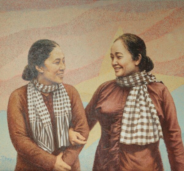 Họa sĩ Nguyễn Thu Thủy, đại diện Ban Tổ chức cho biết, đằng sau mỗi tác phẩm là những câu chuyện cảm động của họa sĩ và những nhân vật mẫu vẽ của họ. Năm 1966, họa sĩ Lê Lam xung phong vào sáng tác tại chiến trường miền Nam. Tại đây, năm 1967, ông đã tìm gặp nhân vật chị Tư Cào – người đã tay không ngăn xe địch ở Long An lúc bấy giờ để vẽ ký họa. Sau đó ông đưa vào bức tranh cổ động vẽ chị Tư Cào hiên ngang đứng trước xe tăng địch, dưới gầm trời xám loang lổ khói bom, máy bay trực thăng nhiều như ruồi trên cánh đồng lúa vàng. Trên xe, người lính Mỹ giương súng trước mặt chị Tư Cào.Tranh đề “Dân tộc Việt Nam chưa bao giờ chịu khuất phục”, sau chính thức mang tên “Dừng lại”. Bức tranh đầu tiên ấy sau đó bị quân địch thu giữ như chiến lợi phẩm. Khi họa sĩ Lê Lam về Trung ương Cục đã vẽ lại bức tranh gửi ra Bắc. Khi tranh được triển lãm, tác giả đã rất xúc động khi được biết Bác Hồ đã đứng rất lâu trước bức tranh rồi nói: “Cái này mạnh hơn sắt thép đấy. Các chú in ra cho toàn dân và thế giới xem“.