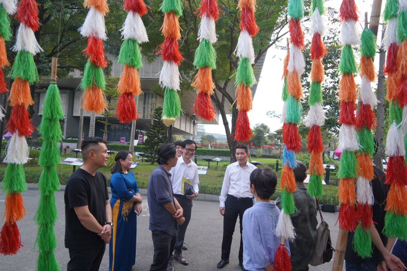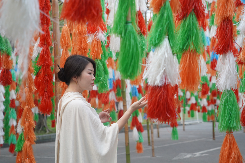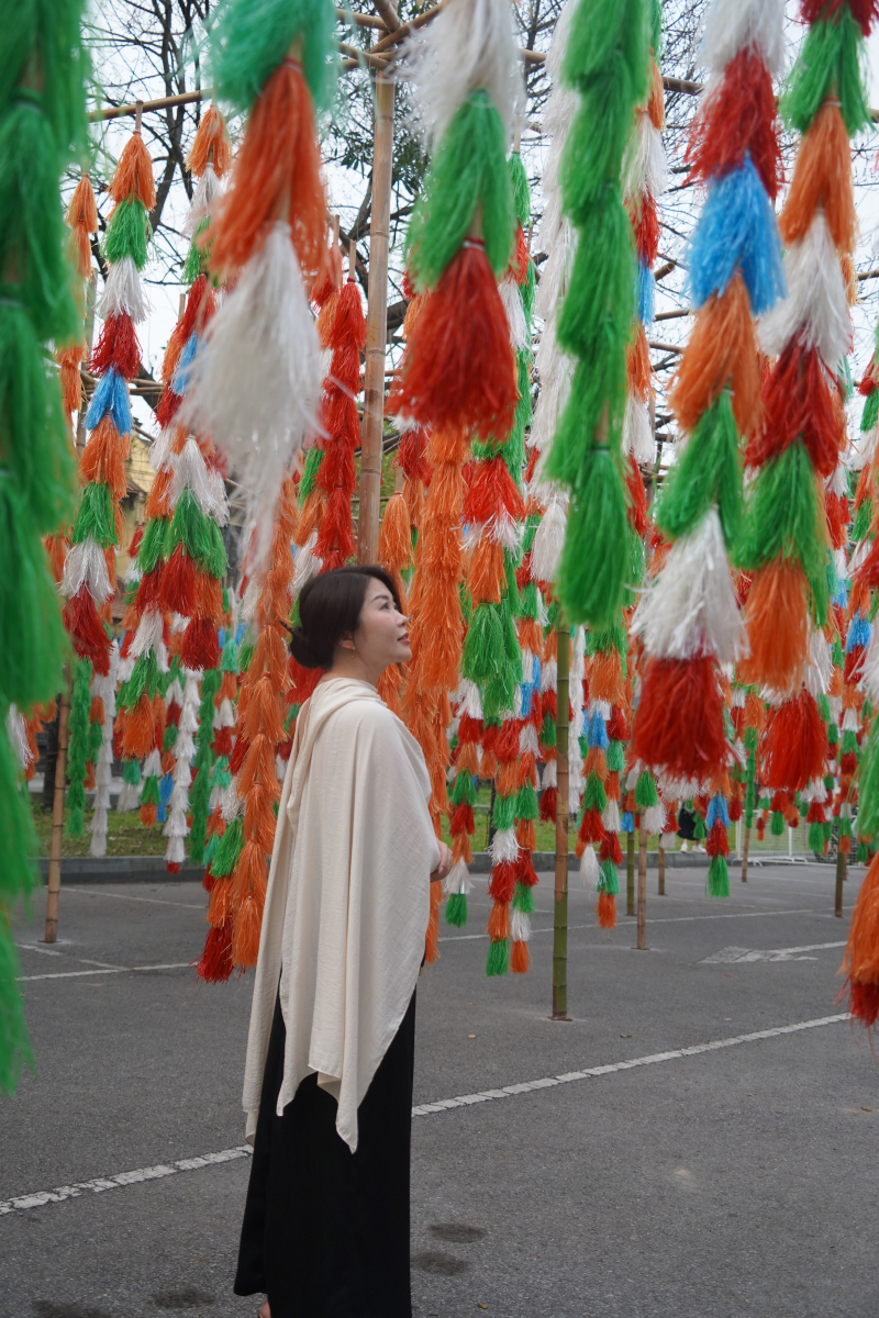 Tác phẩm được kiến tạo từ hệ thống roi tuồng làm bằng vật liệu tái chế, treo trên giàn tre mộc mạc, tạo thành cấu trúc mở với những nhịp điệu chuyển động mềm mại trong không gian. Sự kết hợp giữa tre – chất liệu truyền thống gắn bó với đời sống văn hóa Việt – cùng các dải màu tươi sáng đã tạo hiệu ứng thị giác sinh động, gợi cảm giác chuyển động liên hồi như nhịp mùa xuân đang lan tỏa.