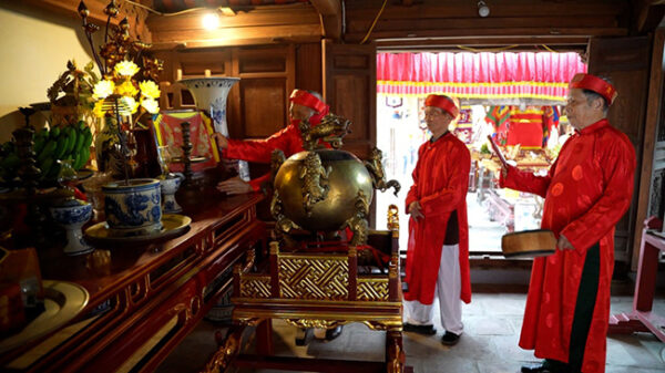 Tại Đền thờ làng, nghi thức tế lễ được cử hành theo đúng cổ lệ. Khói hương nghi ngút hòa cùng lời xướng tế trầm hùng, cầu cho quốc thái dân an, cho con cháu học hành tấn tới, quê hương ngày càng hưng thịnh.